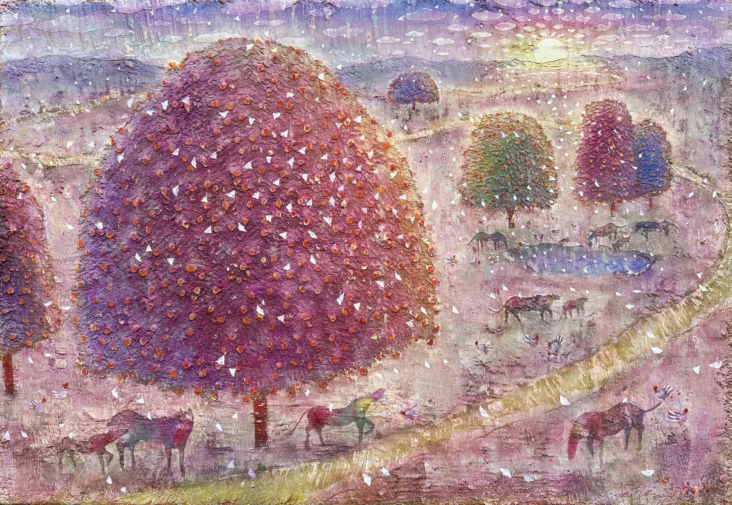 朝陽に染まる道と林檎の木